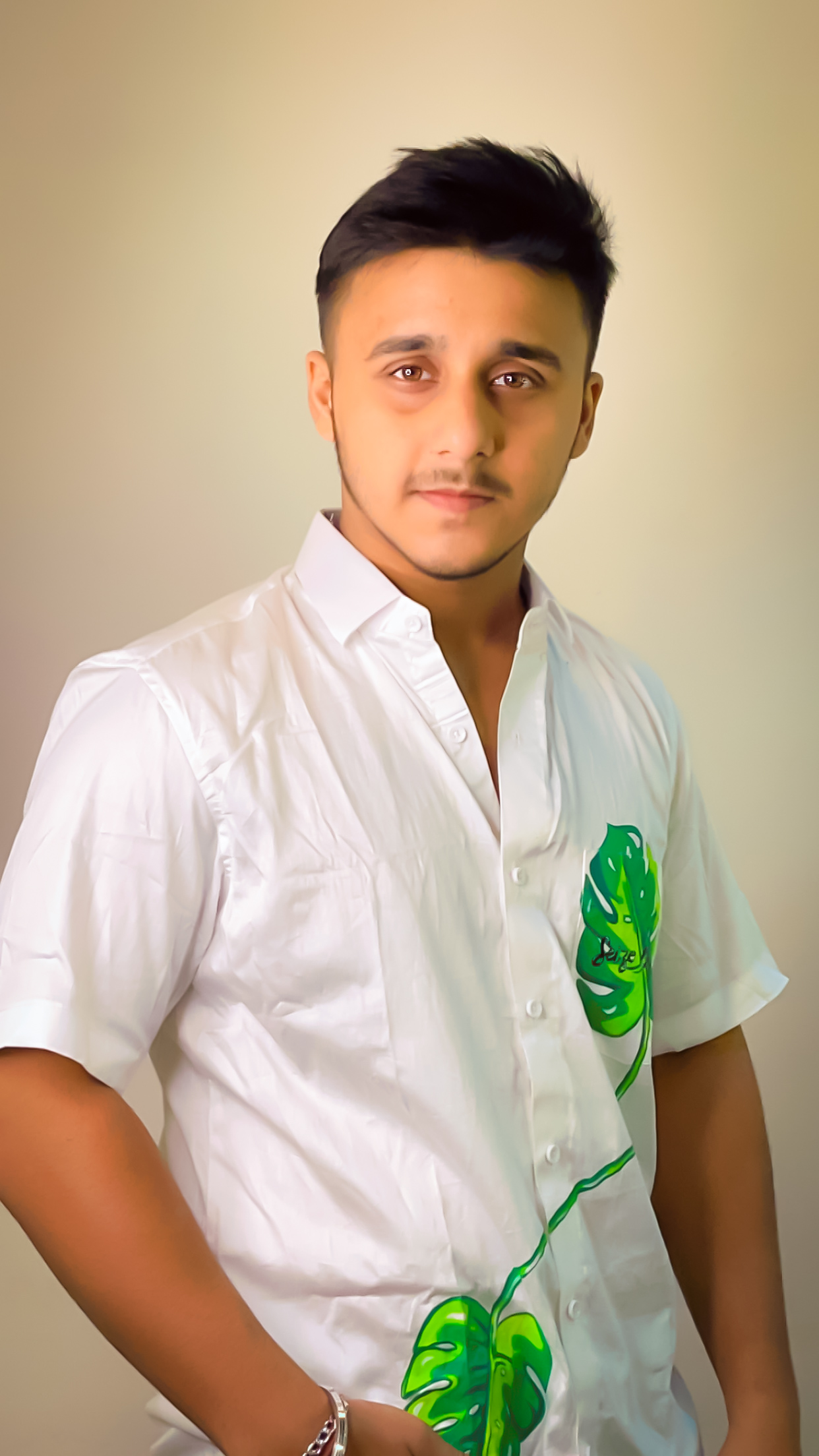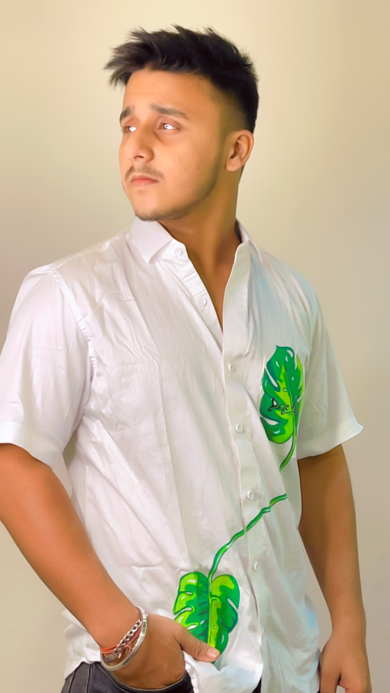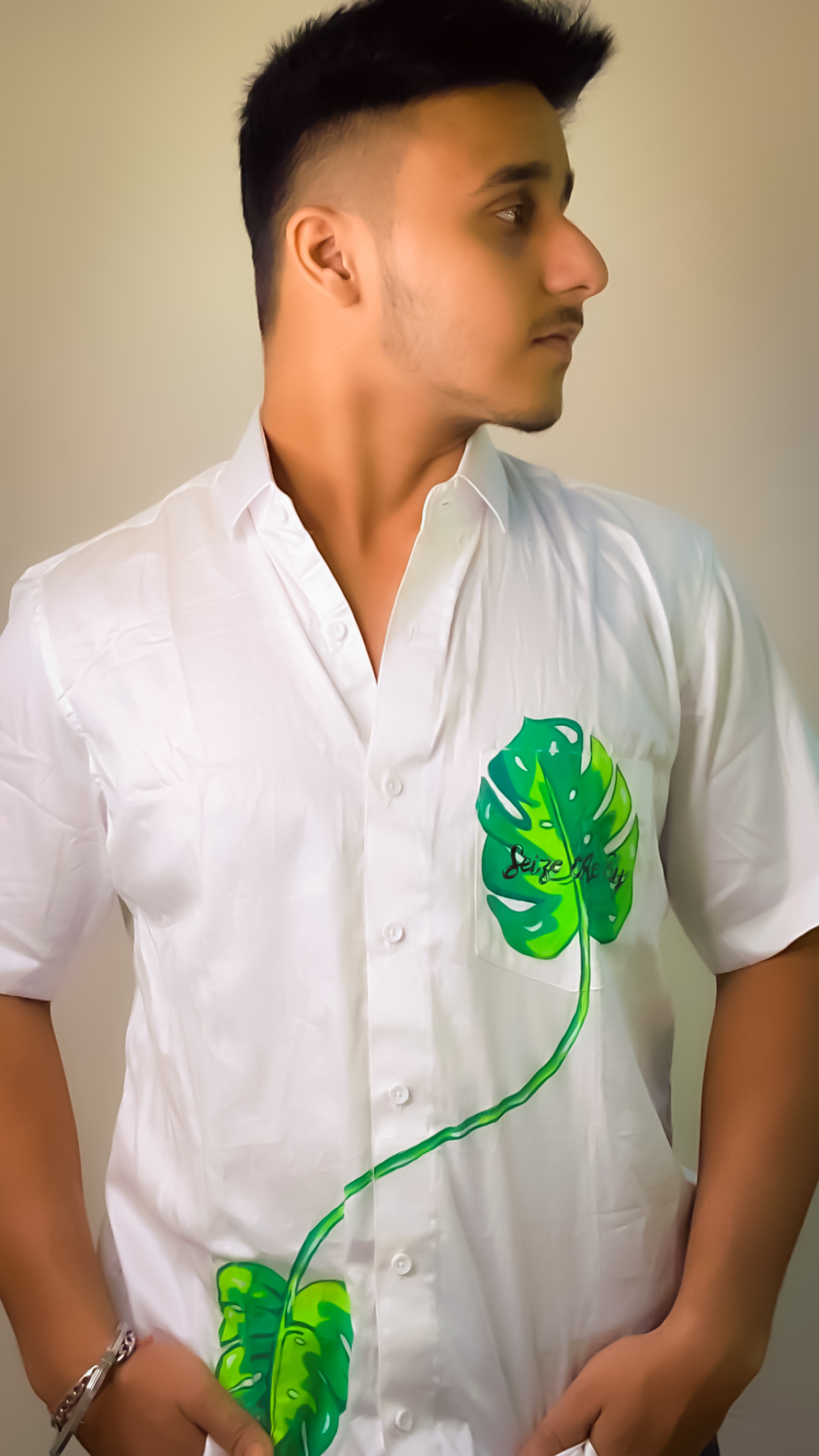 Men’s white oversized half sleeves pure cotton shirt featuring a distinctive hand-painted design of a green leaf on the chest accompanied by text “SIEZE THE DAY” in italic letters in black. This combination of white, green and black turns it into a soothing design that radiates hope, joy and positivity.